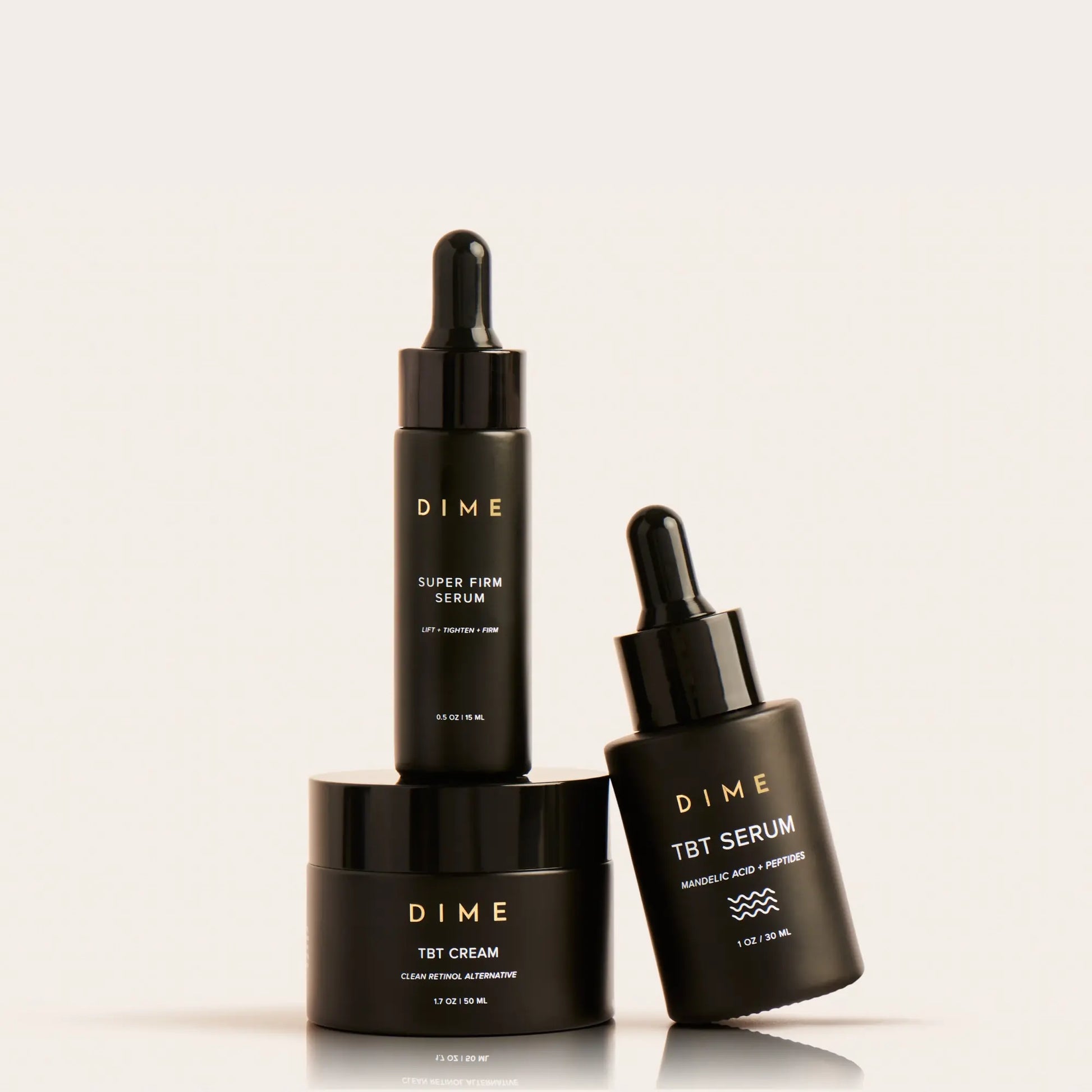 Dispense a pea-size amount to fingertips or directly to face. Lightly pat and press into the skin in the area(s) of concern, common areas being crow’s feet near eyes, smile lines, forehead lines, etc. Apply after toning and allow to dry before applying any DIME facial serums or moisturizers. Apply in the morning, the evening, or both if desired/needed.